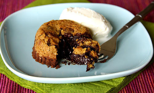 Pour the batter over the cookies in your prepared muffin tin. Bake in preheated oven for about 8 minutes. The cakes will be slightly firm around the edges but still soft in the middle. Let the cakes stand a minute or 2 before serving. Remove each cake from its tin, invert it onto a plate (just like a tarte tatin!), remove its liner and serve with your favorite vanilla ice cream.